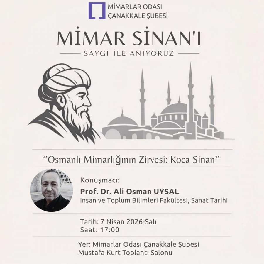 Osmanlı mimarlık tarihinin en önemli şahsiyetlerinden biri olan Mimar Sinan’ın ele alınacağı konferans, 7 Nisan 2026 Salı günü saat 17.00’de, Mimarlar Odası Çanakkale Şubesi Mustafa Kurt Toplantı Salonu’nda gerçekleştirilecektir.